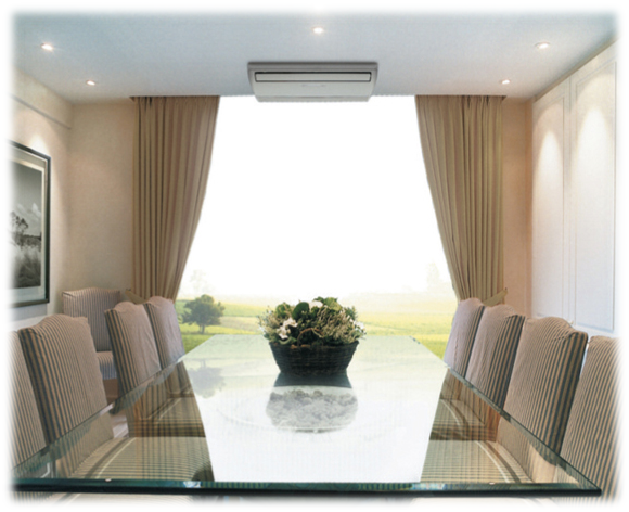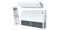 В больших помещениях без подвесных потолков для качественного кондиционирования требуется климатическое оборудование с большей производительностью. Эти требования с лёгкостью исполняют напольно-потолочные сплит-системы. Они устанавливаются на потолке или на стене ближе к полу.
